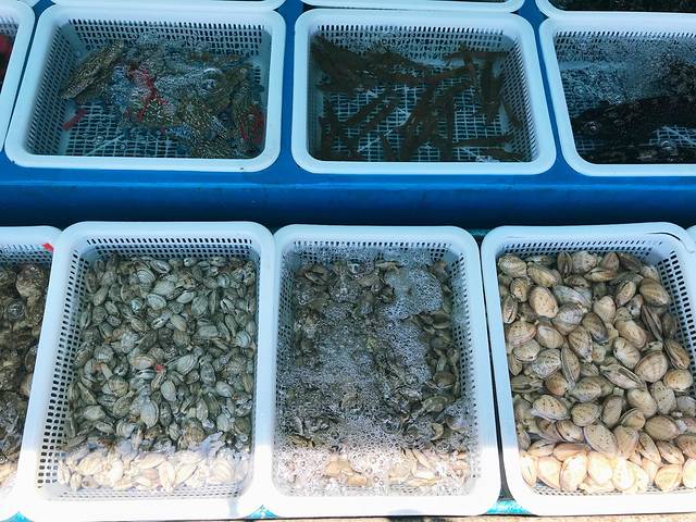 码头这边的海鲜都是鲜活的 渔民大清早打捞上来的 看着这家他们清晨的收获不错 满框的战利品