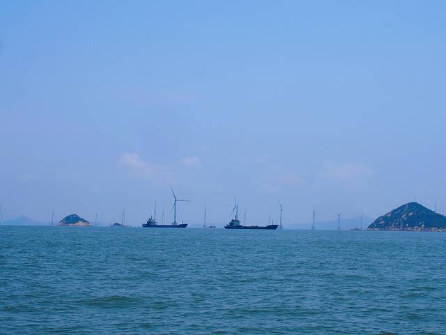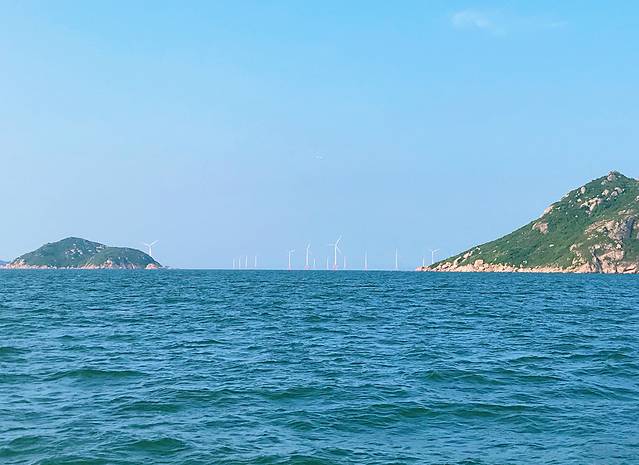 船开出一会,我们在甲板上聊聊天远远的就看到一个遍地都是海上风车的地方那就是我们海钓目的地啦 ~三角岛 !因此岛有三个尖形的山头成鼎状耸立,从远处看成三角形状,故名三角岛。