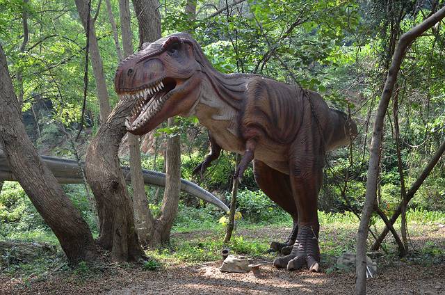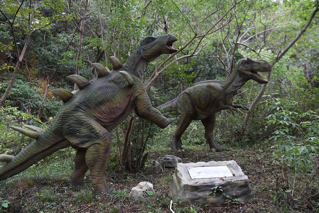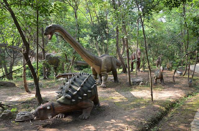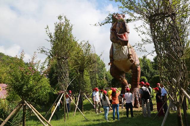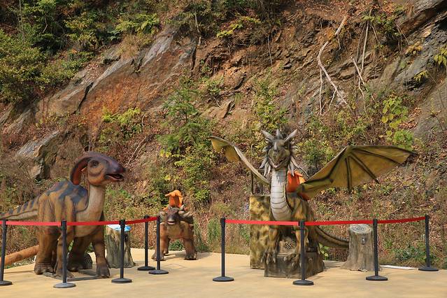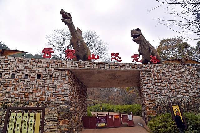 在云雾山竹林寺仙女池与花洋之间长达数公里的森林峡谷中有一座恐龙谷。上百只仿真恐龙、数十个恐龙生活场景让您仿佛穿越到亿万年前,跨越了三叠纪、侏罗纪、白垩纪三个地质时代。