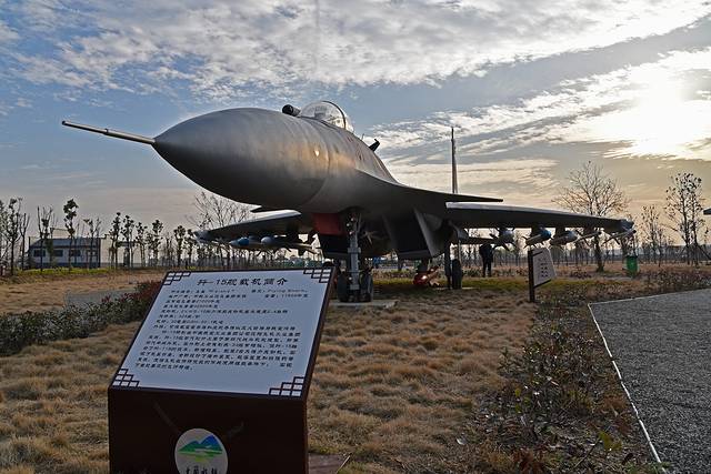 继续向前来到河边,走过浮桥就来到了河西军事体验区,我们看到了航母舰载机歼-15飞鲨的模型。轻盈的体态,强有力的发动机,机翼挂架上威风凛凛的导弹,在夕阳的映照下,更显英姿飒爽,霸气十足。还有了99A坦克,武直10直升机的等比例模型,果然威武。