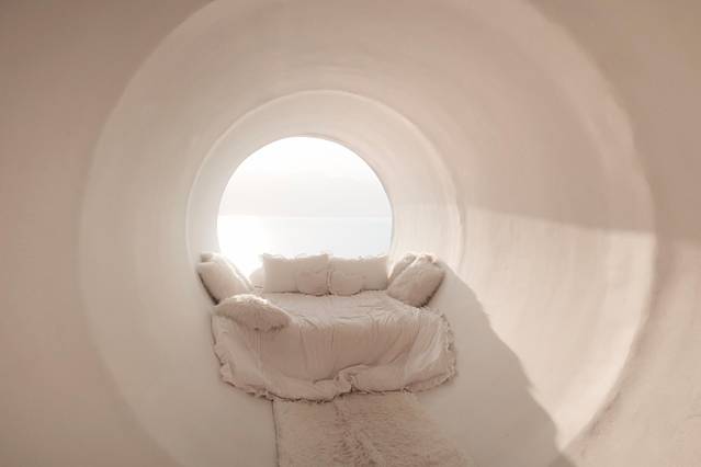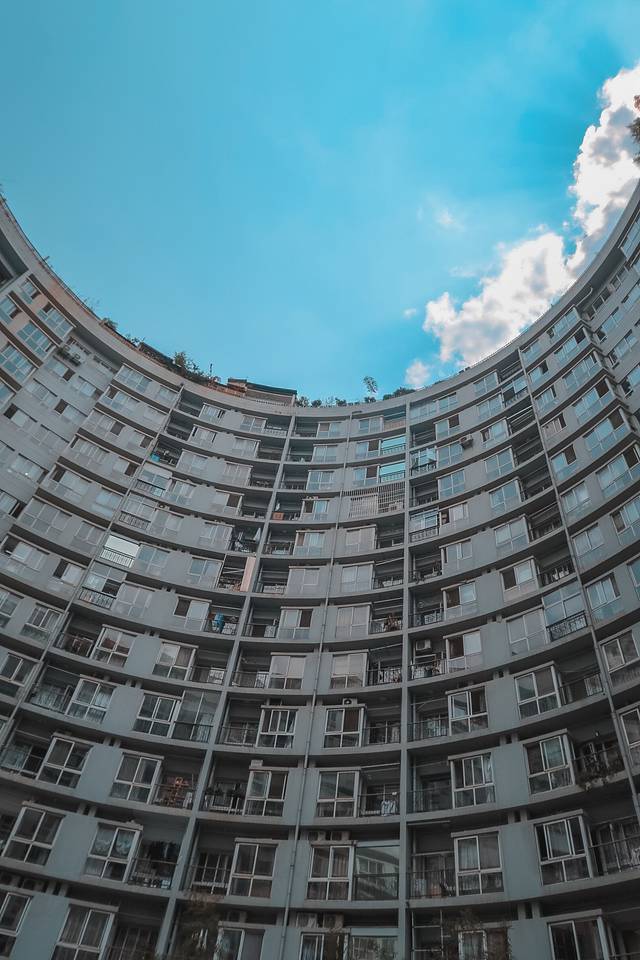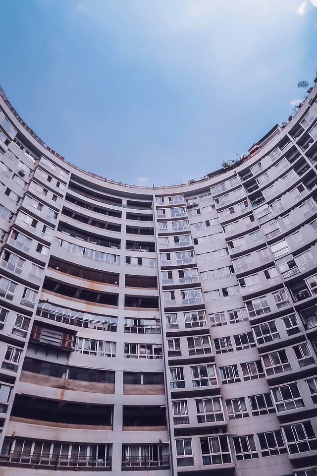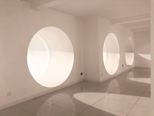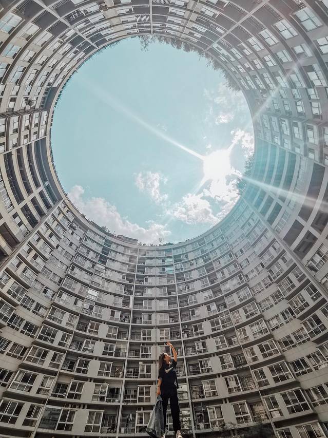 其实这里是一个商住两用的办公楼,拍照的地方在6楼,可以从地下车库坐电梯到6楼,也可以从一楼的门进去,电梯出来后就可以看到了,在中间位置。因为整个建筑是筒型的,所以从里面往外拍,可以拍出圆圆的顶,很酷炫。