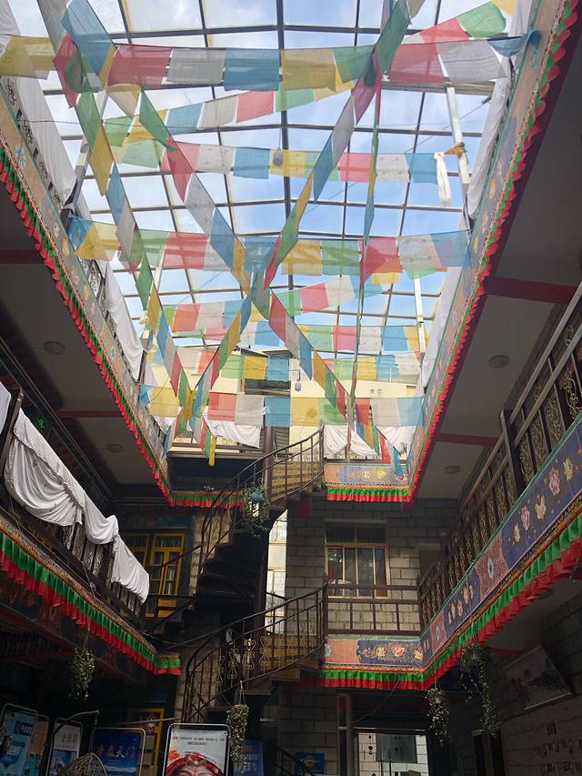 在当地时间10点10分到达拉萨机场,下了飞机就立马到了冬天,所以贴心的机场安排了更衣室,立马换上冬装,出了门就是乘坐到拉萨市区的大巴车,30元一位,现金右边排队,支付宝左边排队,上车去往罗布林卡停车场,不知道是不是因为高反还是因为晕车,总之这一个多小时的车程相当难熬,有种想吐的感觉,吃了颗口香糖含片,闭了会眼睛,终于到车站,拉萨的中午,烈日当头,于是我先找了一个树荫下面缓了缓,等人稍微舒服了一点。打了滴滴去到客栈,(拉萨的滴滴比出租车贵)