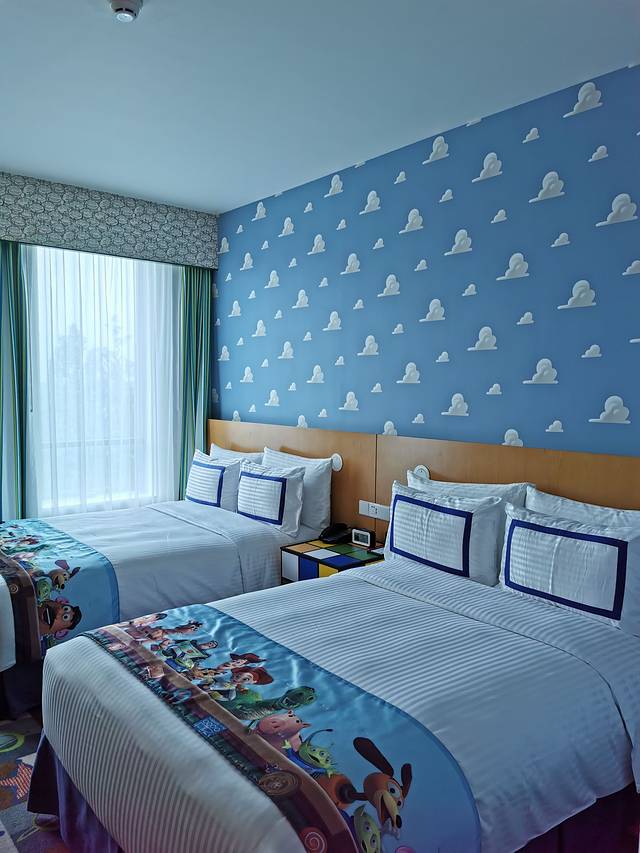在这里给小伙伴一个忠告 ⚠️ 如果想出去玩 一定提前订酒店!越晚订酒店越贵😢 很遗憾本想住迪士尼乐园的 可是等我要定的时候已经涨到四千多了😱果断放弃了 最后选择了玩具总动员酒店 住在这里唯一的好处就是可以走酒店vip 可以提前入园一个小时 至关重要的一个小时!