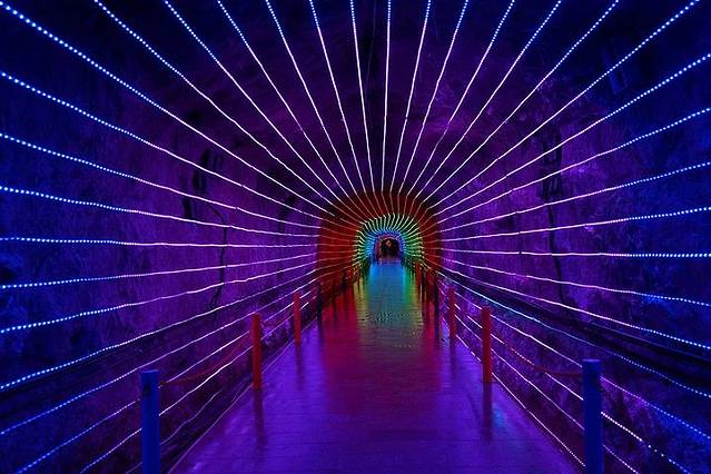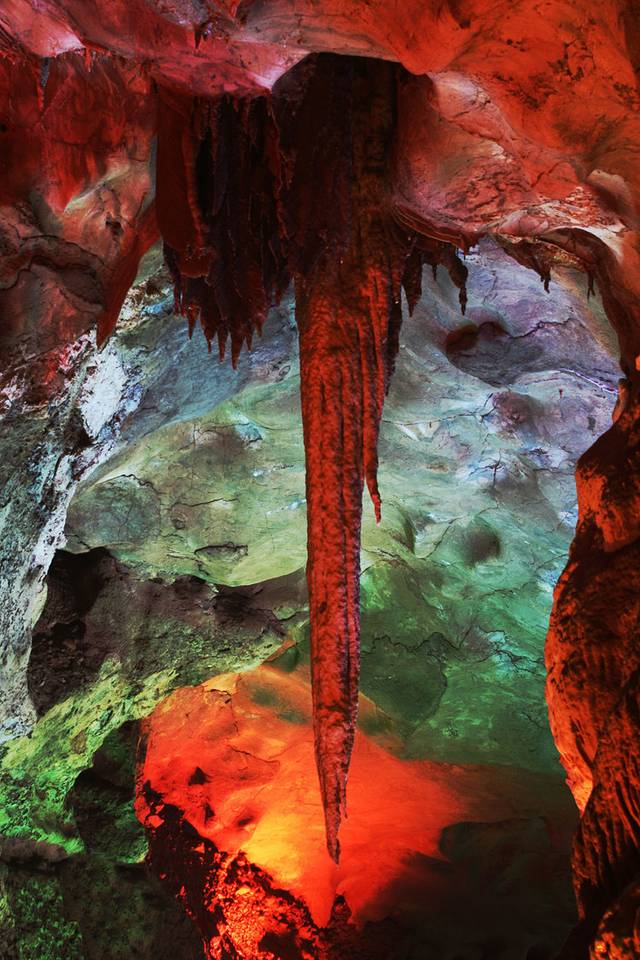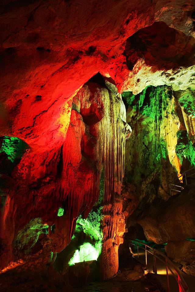 继续沿着山间小道向上就是天子洞了。天子洞内部空间规模非常大且狭长,进入天子洞最先看到的一条灯光五颜六色的通道,伴随着灯光的闪烁迷离,仿佛走进了一条穿越时空的隧道,一下子穿越到了昔日的“仙人洞”之中。