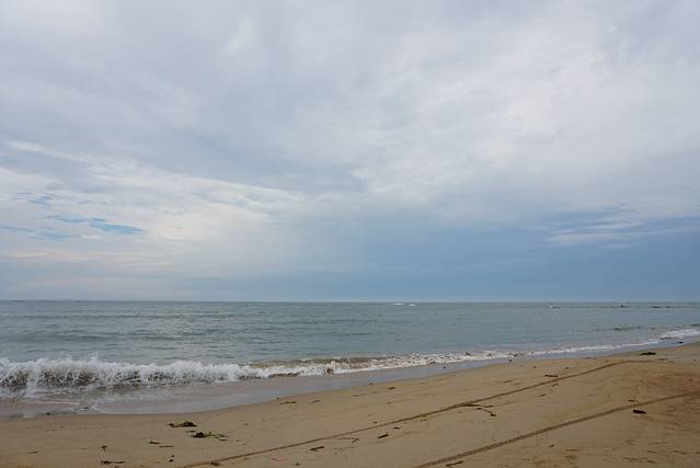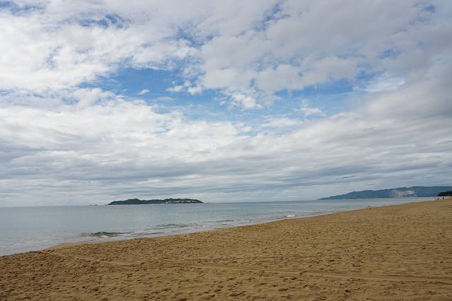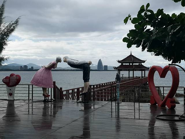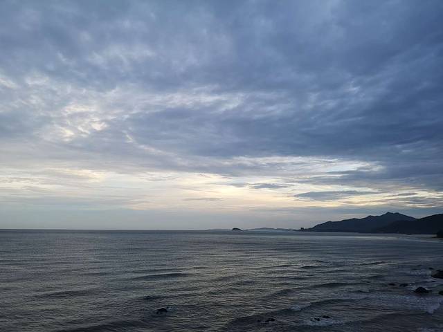 第二天中午来到了琼海,之前在网上看到说有个叫玉带湾的地方很好看,而且人少,我们便也想感受一下这里的安宁,景区不是很好找,在一个看起来像酒店像小区的门里面,导航显示已经到了,但是就是没有看到所谓的玉带湾,我们在周围转了两圈才找到,景区没有门票,进去以后是个别墅群,应该是酒店,车位很多随便停,里面有餐饮娱乐的地方,一直玩下走就是了,海滩上几乎没有人,这天天气不算太好,没有太阳,虽然不晒,但是照片看起来就没那么好看。