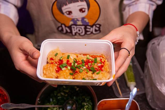 用筷子夹起一块包浆豆腐,使劲地吹,待温度降低可入口后再入口,这种细嫩的口感、香辣十足的口感,不能再爽了。