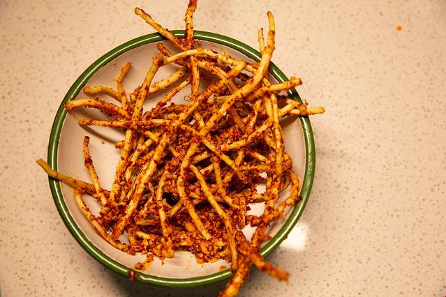 这道折耳根,绝对能算的上他们家的“王炸”菜品了。严格意义上来说,我是不喜欢吃折耳根的,深究下去就是不喜欢吃折耳根的叶子,但是撸辣家的折耳根是根,被油炸后原本特殊气味比较中的折耳根,变得“温顺与听话”了;一种淡淡的清香被唤醒;再配合着调料,吃起很带感。