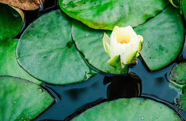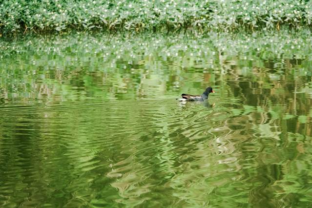 不远处的荷花还未全部开.放,但绿绿的荷叶给这里带来了一片清凉。
