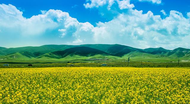 黄色的油菜花、绿色的草原、白色的云朵、蓝色湖面,这一片片景色环环相应,很难想象的到,世界上还会有这么一幅美丽的画面。