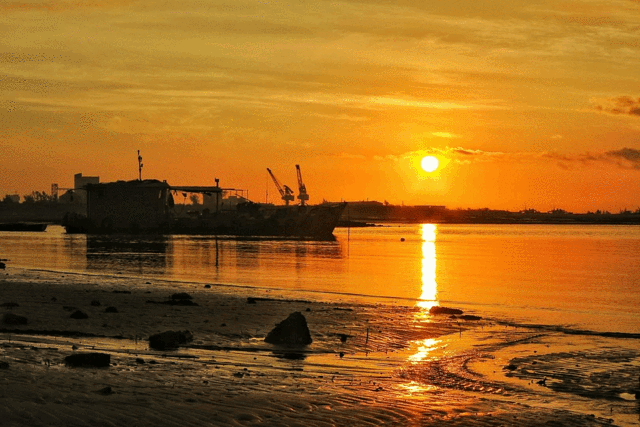 到了傍晚,水天一色,夕阳染红了天,海水倒映出了天,放眼望去整个世界都散发着金色的光芒。