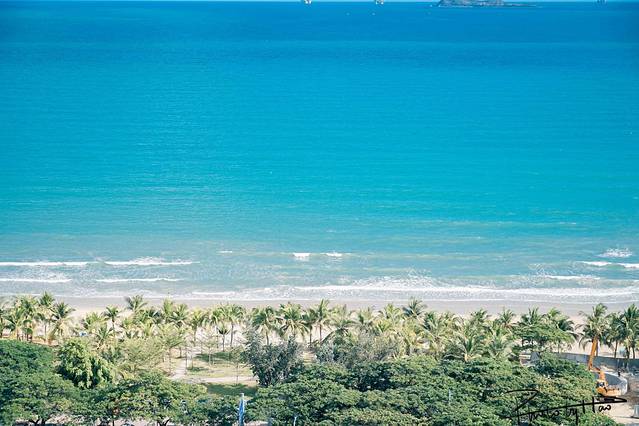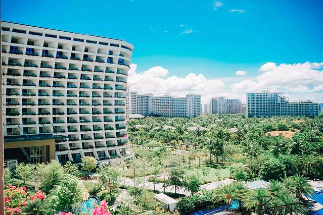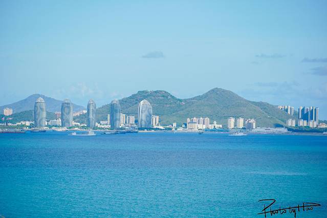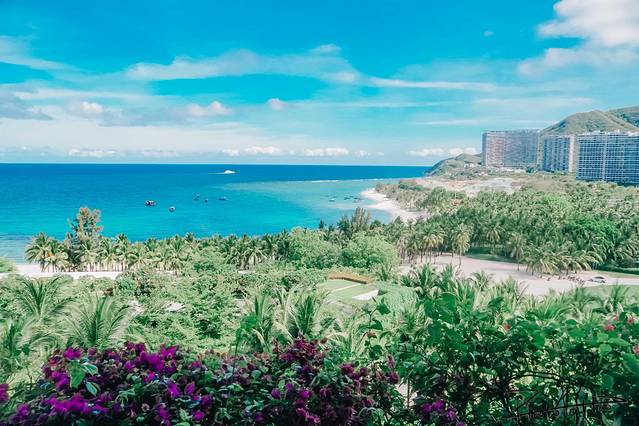 换去另外一侧,这里没有了阳光的直晒,但是风景豁然开朗,可以看到整个 三亚湾 的海岸线,海滩边郁郁葱葱的热带植被和蔚蓝的大海相得益彰。