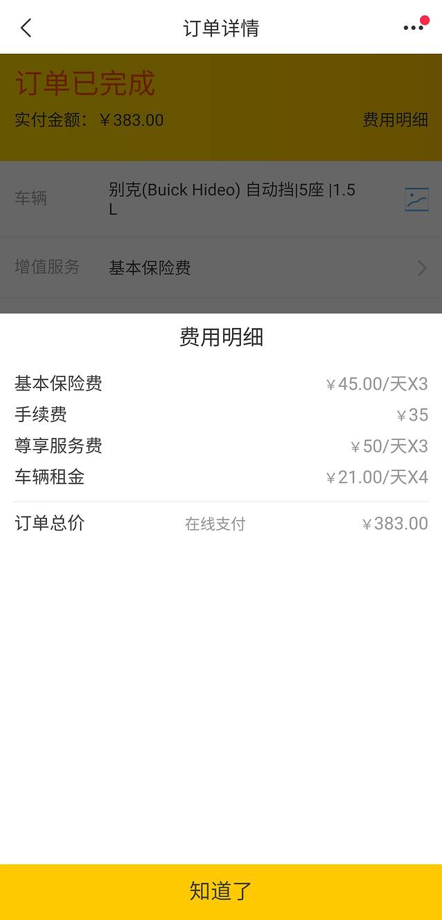 因为这次行程松散且跨度较大,参考了公交和滴滴的价格之后,最终我选择了租车自驾。第一次租车自驾还是在各个平台对比选择了很久,各个车型也考虑了很久。最终选择了一辆普通款有倒车雷达的别克。租了3天的车,租车费只有200不到。加上手续费和基础保险之后,总共价格是380元左右。满油取还。性价比还是很高的了。