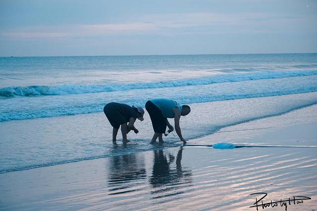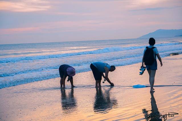 清晨在小 东海 散步。旁边的礁石群有零散的住客在赶海,抓抓小海螺和寄居蟹,情侣和亲子居多。
