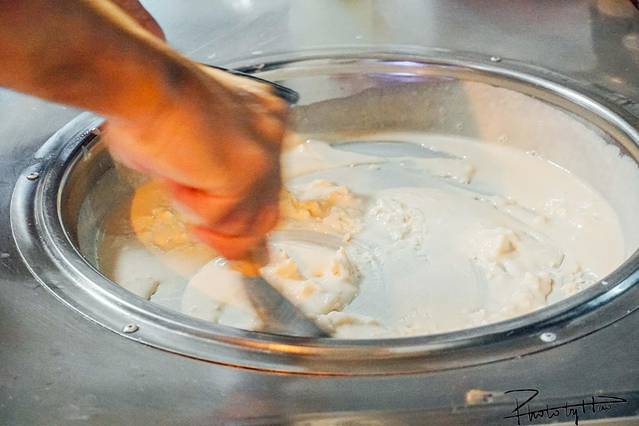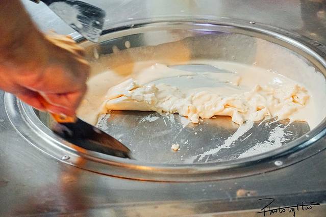 看着炒冰锅的榴莲果肉和牛奶从液体慢慢炒成一整块冰砖。