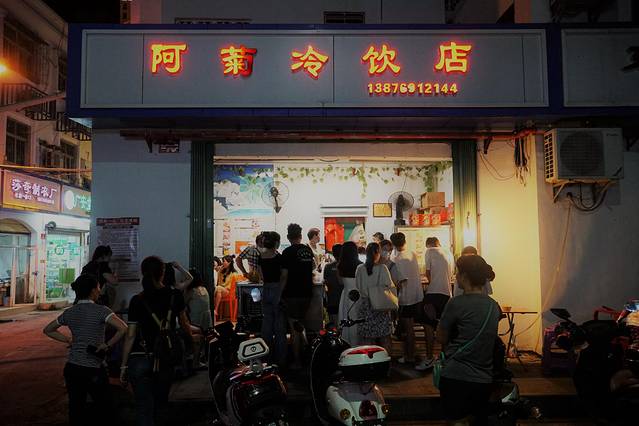 夜晚在老城区逛街的时候偶然看到的这家阿菊冷饮店,普通的小店没有任何的惊奇,但门口却排满了等候的食客。查了一下原来是一家非常有名的炒冰和清补凉店。