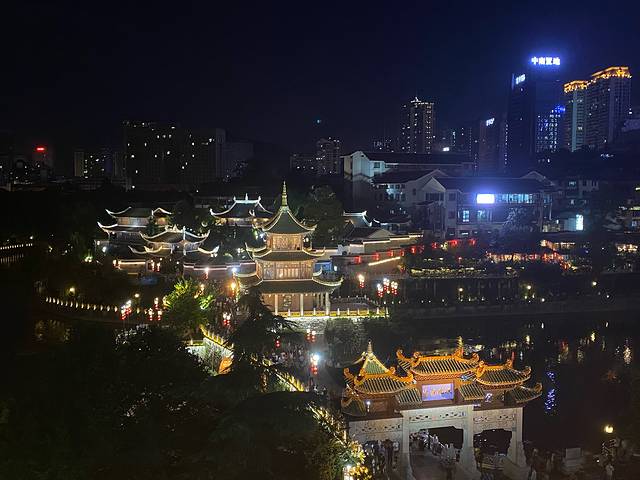 从青岩古镇到甲秀楼开车大概一小时,把车停在家乐福地下,顺便逛了逛街。在大众点评上找到一家必吃 “包整”。饭店在甲秀楼正对面的家属楼上,硬硬爬了四层楼,还排队排了一小时😂😂😂价格不贵,味道一般,可能也是吃不惯的原因。在饭店顶层有个露台,能欣赏到甲秀楼的夜景,照片就是在这里拍的。