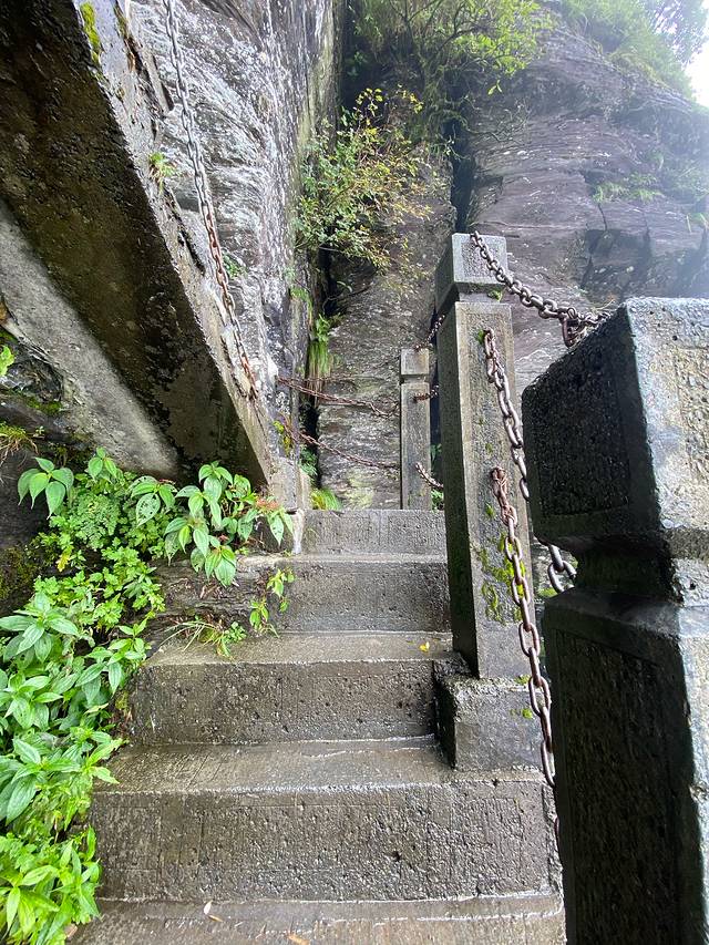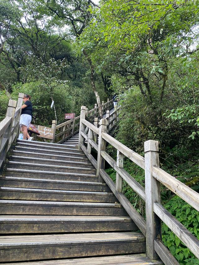 这是老金顶的路,非常陡,很多地方都没办法拍照,得手脚并用的上。体能不好的,高血压心脏病的都不让上。路是单行线,要上就必须走完了。另外就是建议带雨衣,上到高峰以后时不时的都有雨,我们没带就淋湿了。而且山上气温低风大又下雨,建议至少穿一件外套