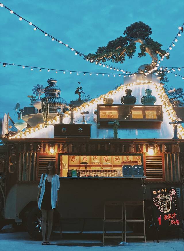 被灯光围绕的小木屋到了晚上也开始发光发亮,屋顶的小风车在柔和的晚风中慢悠悠地转动,夜色灯光的装点下,似乎有种漫步海边的夜市的感觉,一秒穿越大概就是这个意思吧。