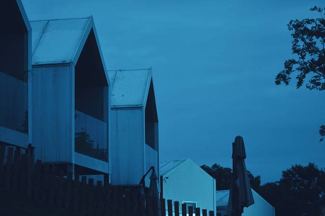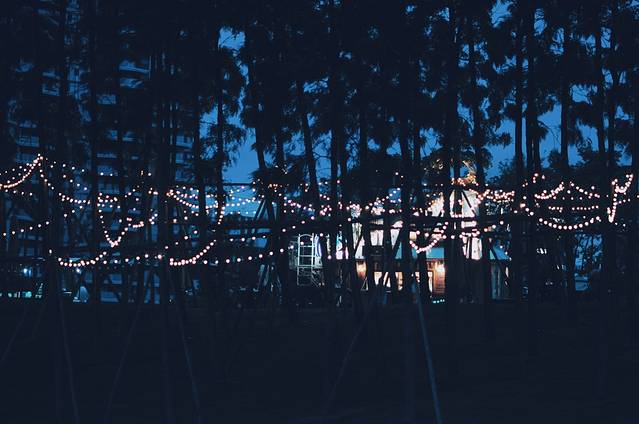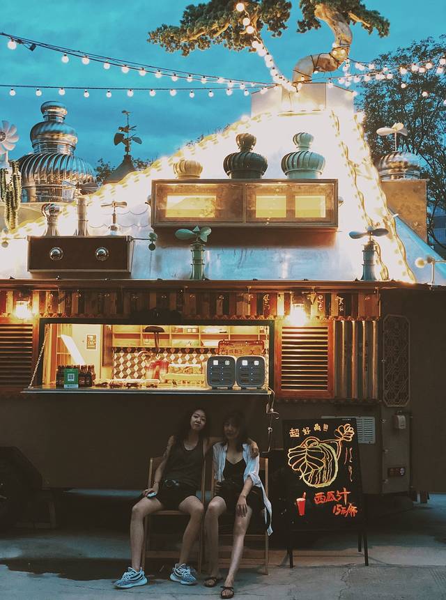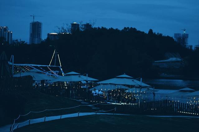 如果你到这里天色还早,那么可以在旁边的咖啡馆休息片刻。傍晚时分,这里的夜色一定会给你巨大的惊喜。夜色阑珊,墨蓝色的天空下,小森林里透出参差不齐的光,像极了水晶球里的童话世界,美得都有点不真实了。