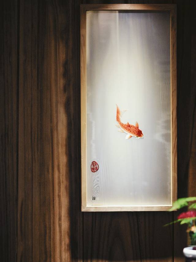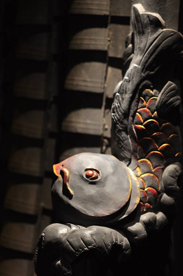 进入大门,映入眼帘的是左右各一只“灰塑”而成的鲤鱼,形象为腾跃之势,而前方两侧是用青瓦所筑成的墙壁,配以金黄色的灯光,一幅“鲤鱼跃 龙门 ”的景象就这样跃然纸上。
