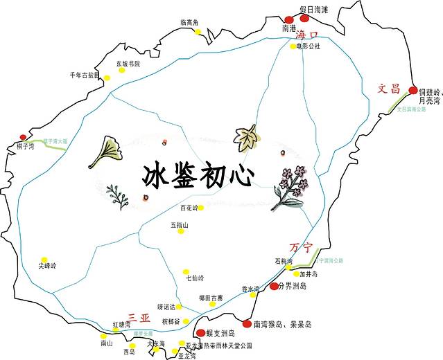 文昌:月亮湾;铜鼓岭(可俯瞰整个月亮湾),主峰300多米;东郊椰林;