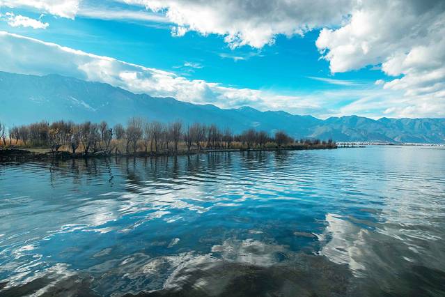 蓝天下的洱海,像一颗湛蓝且细长的蓝宝石