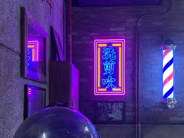 老式的理发设备和霓虹灯牌,坐上复古的椅子,你又想做个怎样的头发,大波浪还是一匹瓦。