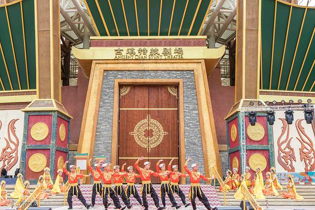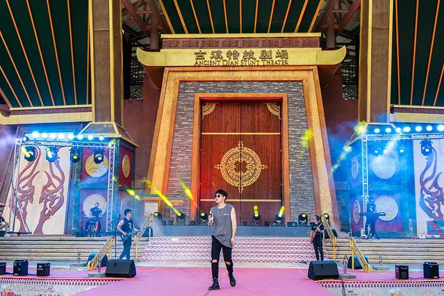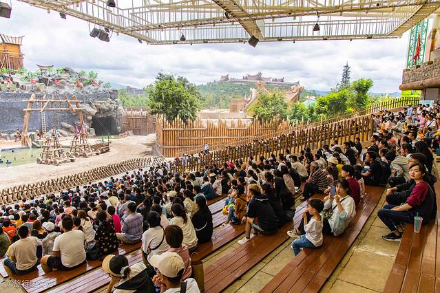 在 云南 欢乐世界我有幸现场欣赏了古滇特技剧场的剧目《古滇风云录》,该剧目是以两千年前西汉时期的古滇国和周边部族战争为背景的特效实景大战。剧场占地面积非常大,场地足足可以容纳2000多人,我去的时候人流真的特别多,剧场上有很多游客观看和拍照,热闹非凡。
