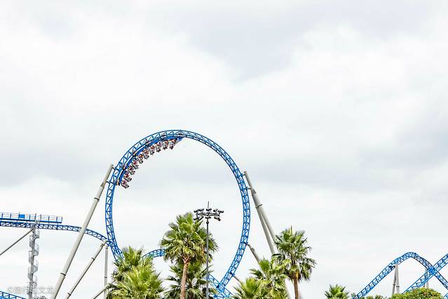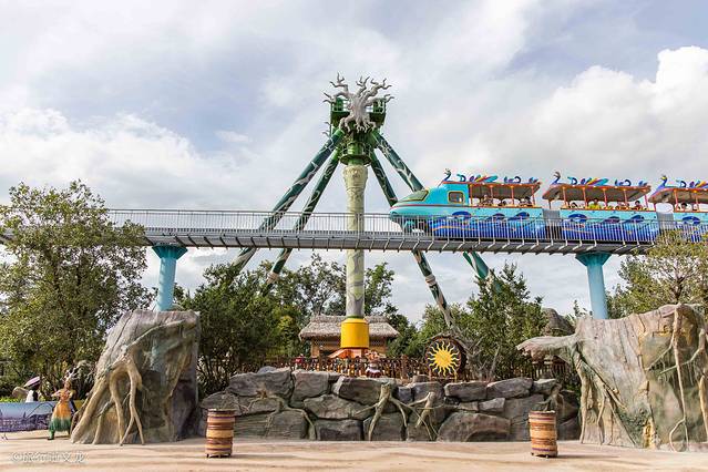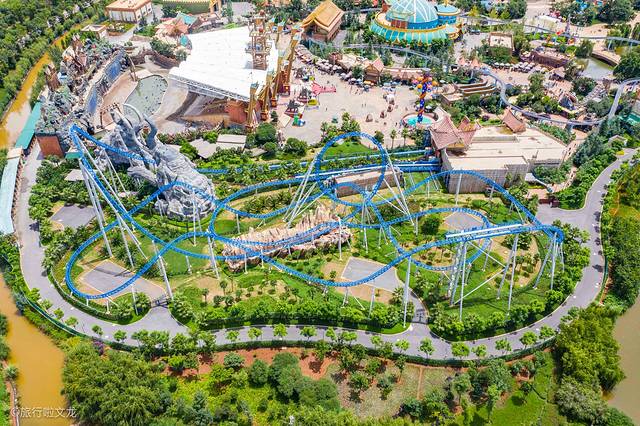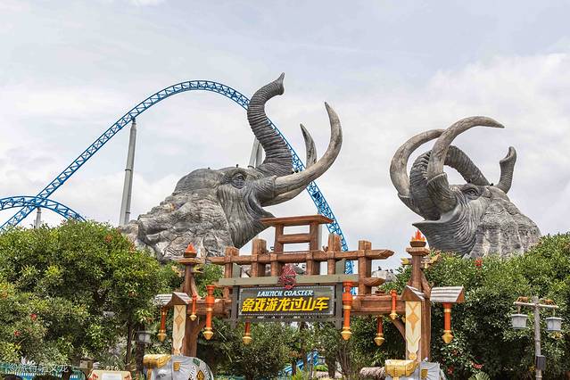 这里有着蓝色和红色的过山车,都有自己的名字,一个叫做象戏游龙过山车,另一个是雪鹰宽翼过山车。先来说一下蓝色的过山车,看到两个壮大的象头作为过山车的头,这样的大象造型就像两只在欢乐玩耍的大象,看来叫做象戏游龙过山车还是有一定的道理。站在旁边看了一下,这个过山车的速度好像比红色的还要快还要刺激。