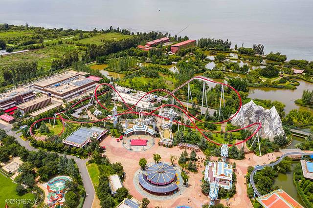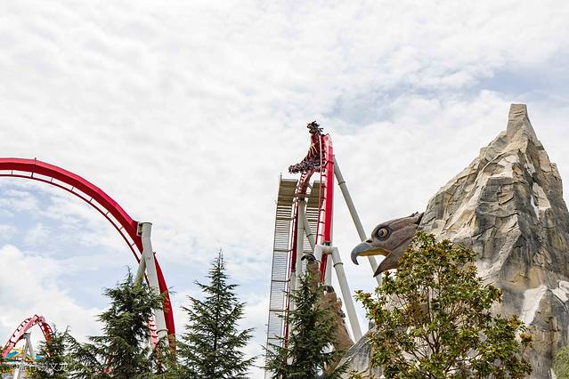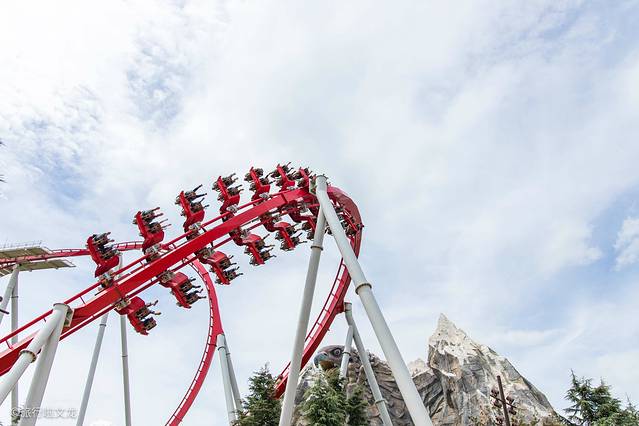 再来说一下红色的过山车,轨道和场景是以 梅里雪山 和雪鹰造型打造的,过山车叫做雪鹰宽翼过山车还是很合适的。也是我这次去体验的过山车,这样的360度旋转滚动,十分的刺激,想睁眼看的但是失重的感觉却让我紧闭双眼,再次疯狂的尖叫着,但是发现身旁的人叫的比我更大声,由尖叫就变成了傻笑。