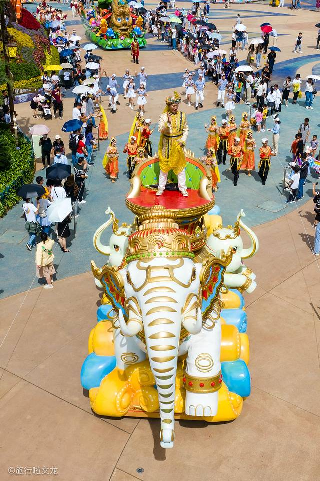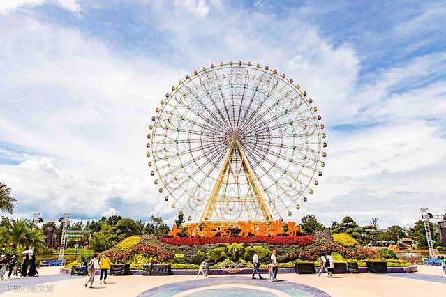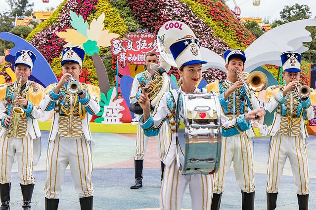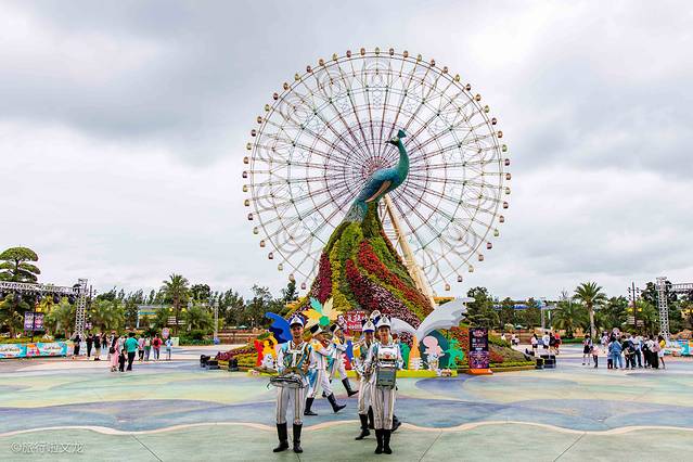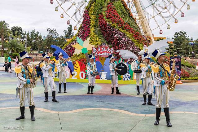 来这里赶上了盛夏狂欢季,外国乐队欢迎宾客穿上富有异域风情的服装,用不同的乐器演奏着欢迎曲,曲调铿锵有力。一个个也是精神抖擞和面带笑容。身后孔雀的造型依托着摩天轮,就犹如孔雀开屏一般。孔雀造型旁边有各种各样花开着,在视觉上产生了美感。