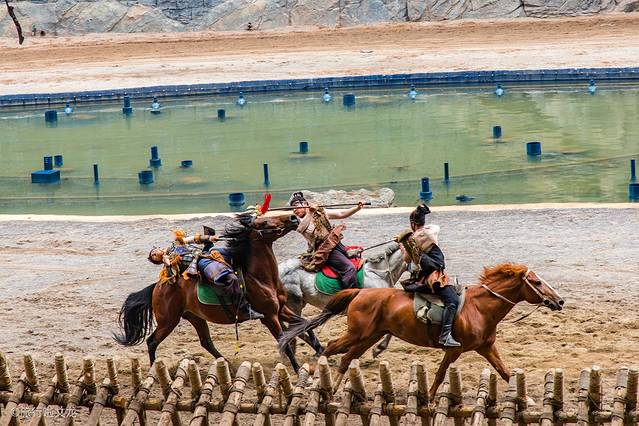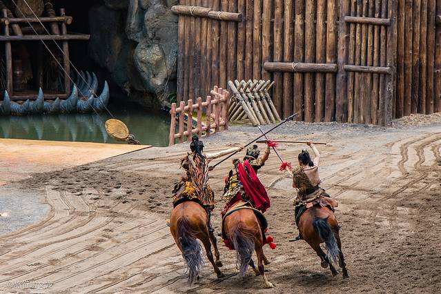 场上热烈的气氛在整个剧场的上空飘荡着,演出也愈演愈精彩。在剧情的发展下,上演了马上格斗、马术特技等精彩的表演。不得不佩服演员们精湛的马术,在马背上进行各种危险的动作表演,淋漓尽致地给游客展现出古滇文化的“神秘、神圣”。