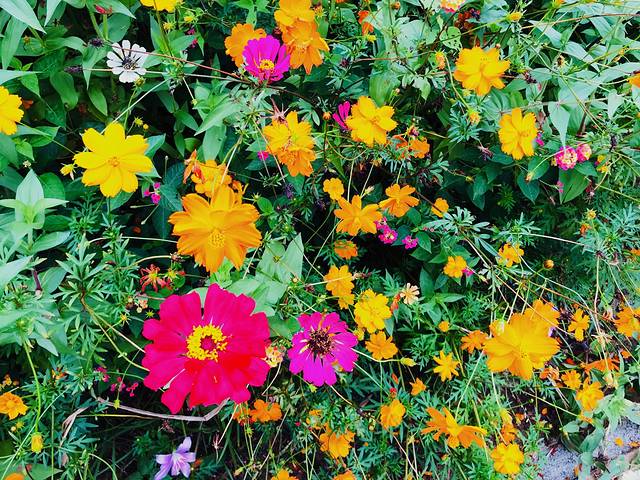 步道比较窄,两边种满了这样的鲜花,远处是连绵起伏的山和大片的稻田,真的就像走在画里一样,每一步都有惊喜。骑着小电车穿梭在花丛中,感觉自己就像仙女一样。