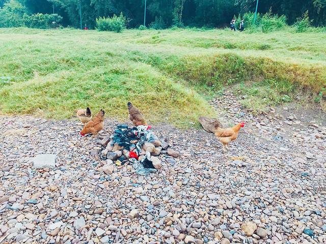 远远看见几只鸡在聚堆吃东西,再一看这不是烧烤堆吗,你们是真不怕直接被烤熟了吗,哈哈。本来还想过去逗逗它们,但是当这几只一起向我走来的时候,我承认我是真的害怕了,哈哈,一路小跑就溜了。