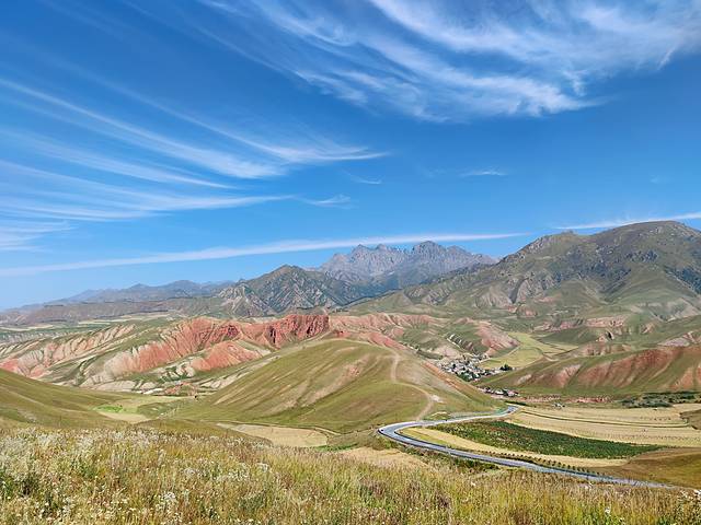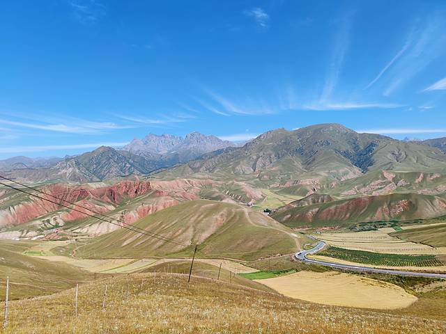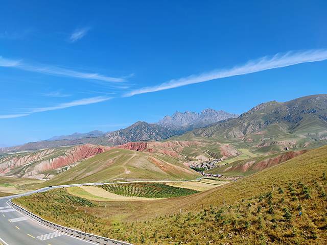 晚上去张掖,从敦煌出发,遇到的一大片草地,好辽阔,朋友说接下来的路开始看到草原了,因为我们往卓尔山,祁连山方向走了,那里有丰富的水源,养殖很多牛羊,我们一路开车,走过盘山公路,穿过峡谷,翻了几座山,后面的路会越来越平了