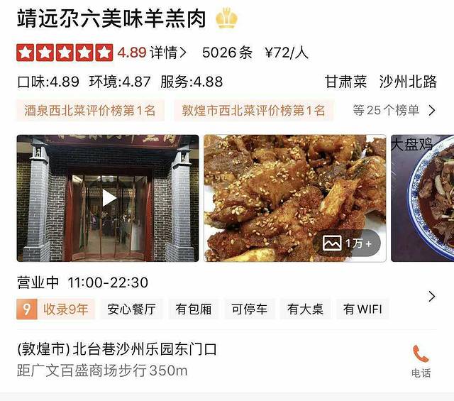 满分的话我给100分,中间茶水没停过,喝完又去呈一壶,点了几道菜都不错,光碟,真的推荐你们来敦煌玩来这家,地道,实惠,环境卫生,手抓羊肉必点