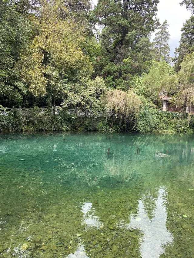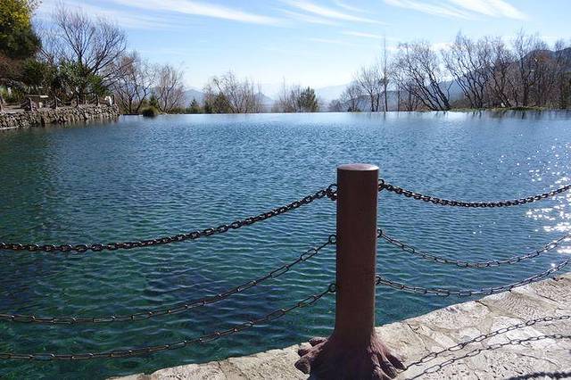 玉水寨景区位于玉龙雪山南麓、丽江城北十余公里,是丽江坝的主要水源地之一。整个景区东、西、北三面,是常年郁郁葱葱的青松山林,南面朝丽江坝子倾斜,景区北端一道山崖下,两株被列入云南古树名录的千年古树,枝叶繁茂,双树成林。古树下一股流量为每秒0.5立方米的清泉喷涌而出,带着水花向南流,注满一个又一个玉水潭,形成三叠水瀑布群。玉水潭内饲养着贵族鱼——虹鳟鱼和金鳟鱼