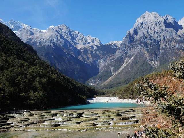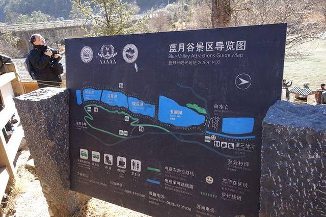 蓝月谷中的河水在流淌过程中因受山体阻挡,形成了四个较大的水面,人称“玉液”湖、“镜潭”湖、“蓝月”湖和“听涛”湖。湖岸四周植被繁茂,远处雪峰背衬。湖水是透明的蓝,近乎凝固的湛蓝中,些许的绿意点缀其间。于湖心四顾,白云连横,浮于山际,倒影在湖面,如梦幻影,疑是仙境