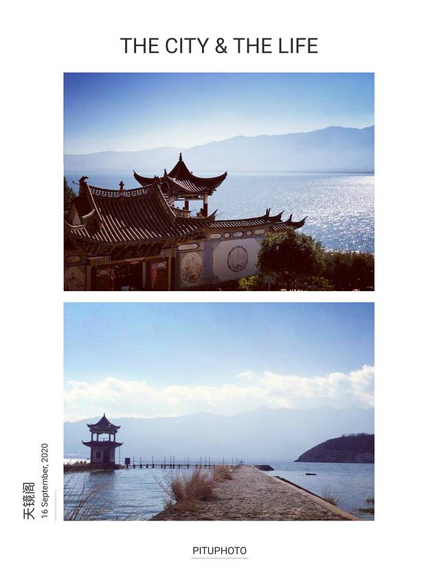 天镜阁在大理洱海东玉案山上,山势到这里忽向洱海伸去,三面临水,悬崖壁立,地势险要,有山环吞海,澄海如镜之势。这里是观赏大理苍山洱海风光的最佳位置。如果运气好,还可看到苍洱奇观——望夫云和玉带云。