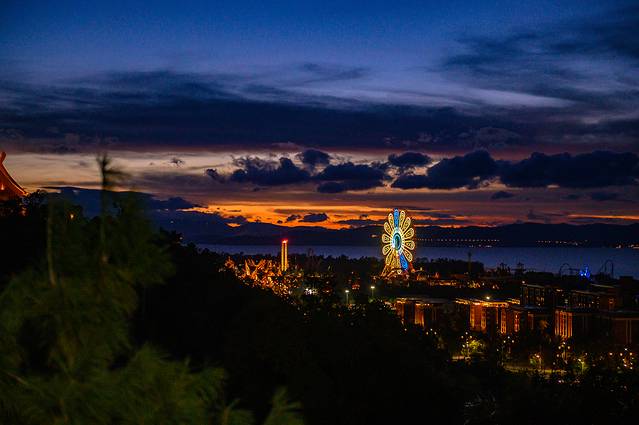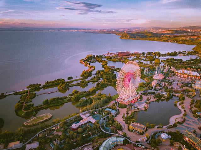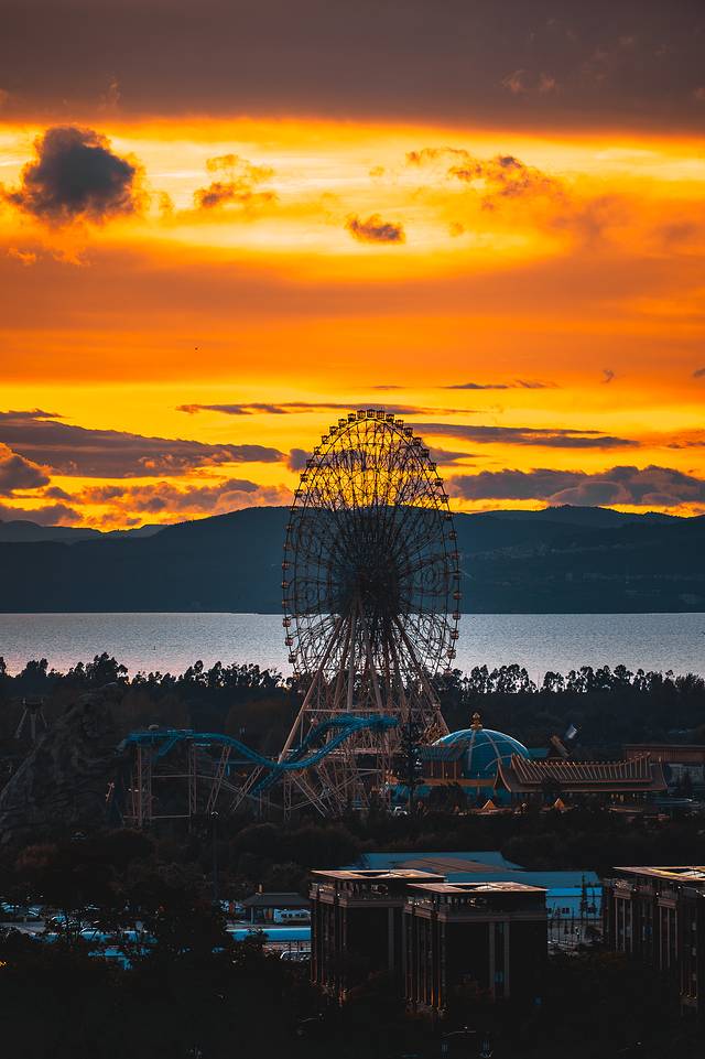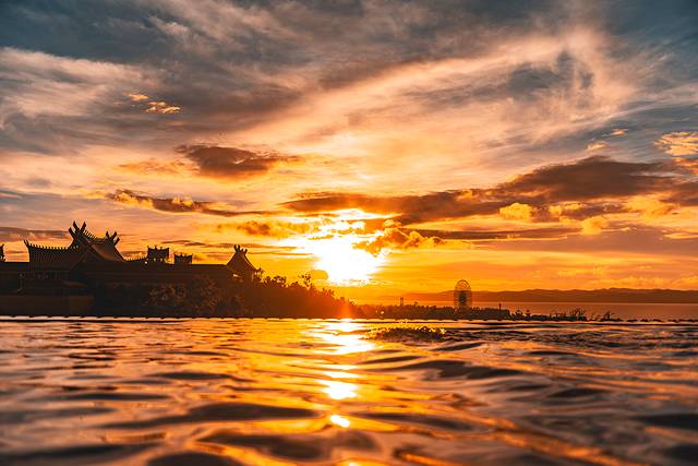 这里几乎每天都会上演醉美的夕阳,躺在水中就能欣赏到远处的滇池、古滇大码头及欢乐世界的摩天轮,灵动的池水倒影夕阳美景,闪着粼粼波光,此时此刻再多的表述都不如眼前上演的浪漫惬意。来,这一杯敬夕阳,对七彩云南·古滇名城说 “晚安”。期待不久,我可以再次入滇,感受它的美学魅力。