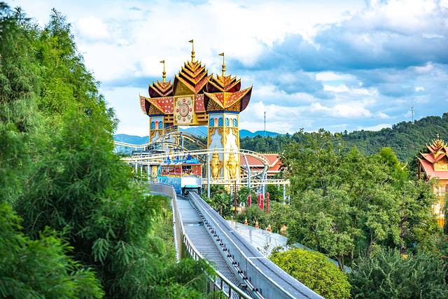 象戏游龙过山车远远望去,犹如一条巨龙与两头大象嬉戏在山谷之间,它是罕见的“发射式”过山车,通过电磁弹射,在2.5秒内将车体提速至105km/h,加速带来的极强推背感远超高级跑车,不仅让乘坐者疯狂欢乐,也感染着周边的游客,激动万分。