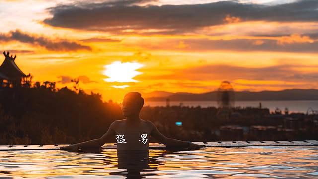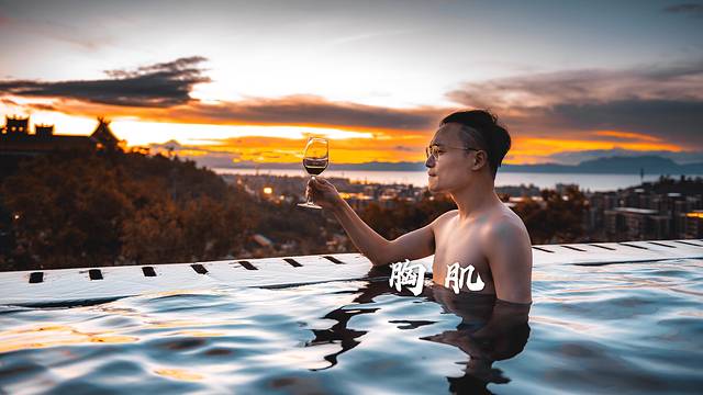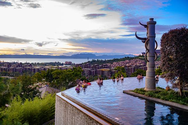 而我最爱的当属山顶的无边泳池,这绝对是云南地区首屈一指的特色泳池之一,游玩一天疲惫的我,在这儿品尝一桌丰盛美食后,便迫不及待的到无边泳池中畅游。
