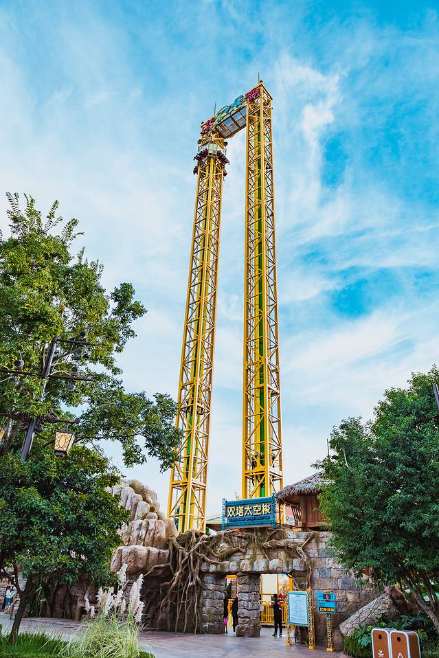 一上一下,超重失重,是宇航员的专属体验,位于洪荒秘境区的双塔太空梭能在数秒内带你上天入地,满足你飞天遁地的少年梦想。在65米高空,你可以360°全方位欣赏全园美景时,不过大多数游客因骤升骤降而紧张到全程闭眼错过。