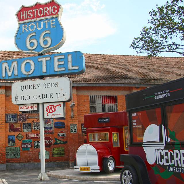 做旧的66号公路路标和涂鸦搭配着老厂房的红砖墙,更添复古气息。