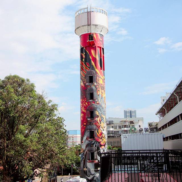 曾经朴实无华的水塔现在被涂满了个性张扬,色彩鲜明的涂鸦,与四周的红砖墙形成了新潮与传统的碰撞。而涂鸦底色为红色的水塔又能恰好融入进红砖墙的氛围中。