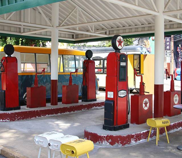 街区内仿造的加油站是个可以坐着吃吃东西的休息区。