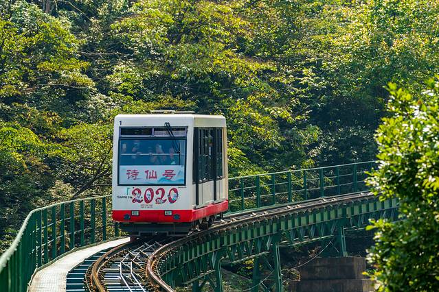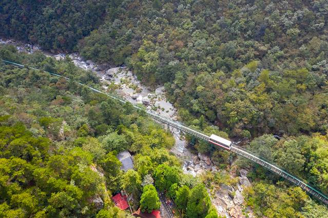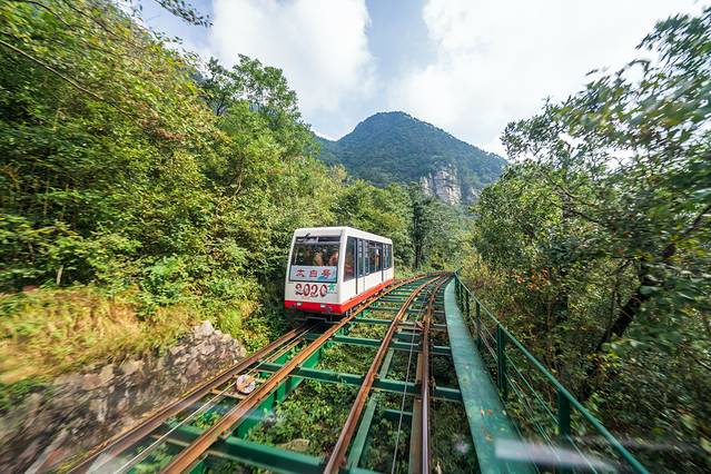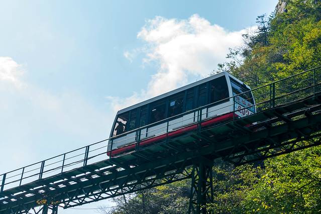 与常规的缆车不同,三叠泉缆车只有两节车厢,往返各一趟,索道全长将近1500米,高度落差在150米左右,采用目前最先进的有轨缆车技术,依山而建,穿梭于山林之中跨沟越溪,不仅可以欣赏美丽清雅的景色,还能够节省宝贵的时间和游玩的体力。