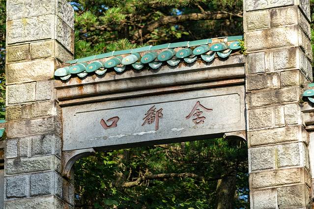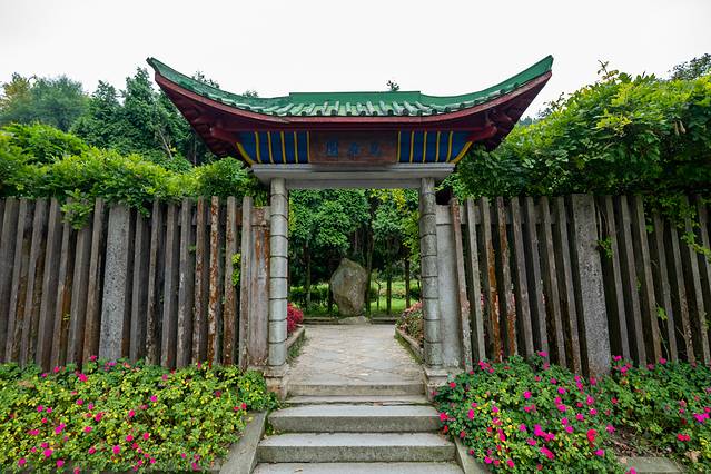 在湖畔,可以看到花径的大门。大门旁书“花径”,两旁刻有“花开山寺,咏留诗人”的对联。
