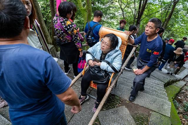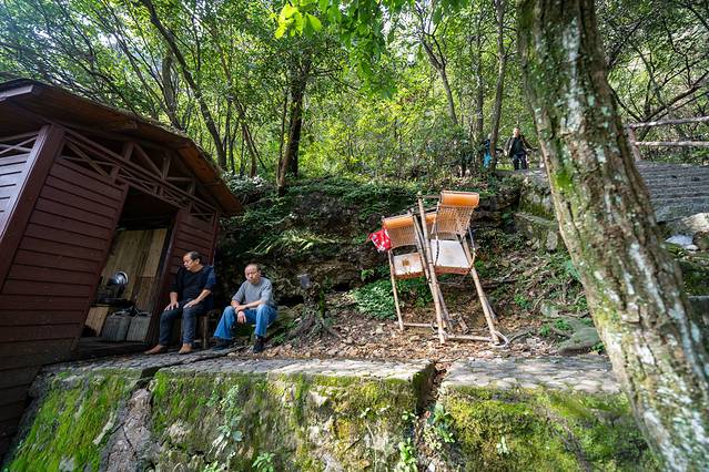 对于体力不是很好的人来说,如果也想到全体去欣赏三叠泉的壮观景色的话,其实还有一种选择,只不过就是价格有点小贵。在上下山的路上,会有很多小的平台,几乎每个平台上都有抬轿子的人在那里等待。但是如果乘轿游览的话,价格可能就会有些小贵,因为上下山路程台阶确实比较陡,即使是两个人抬轿子,确实也很费力气,所以以至于具体坐还是不坐,就根据个人体力财力,量力而行吧。
