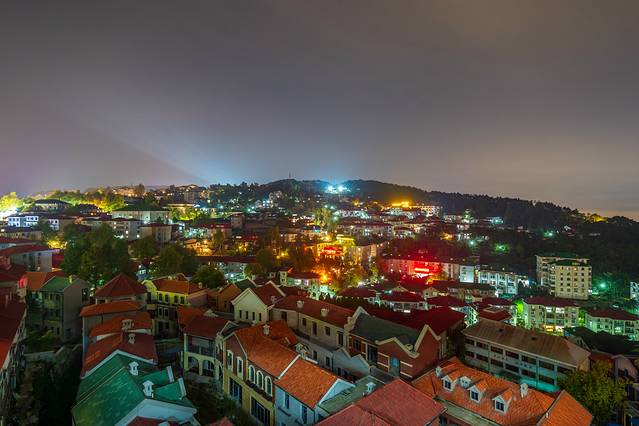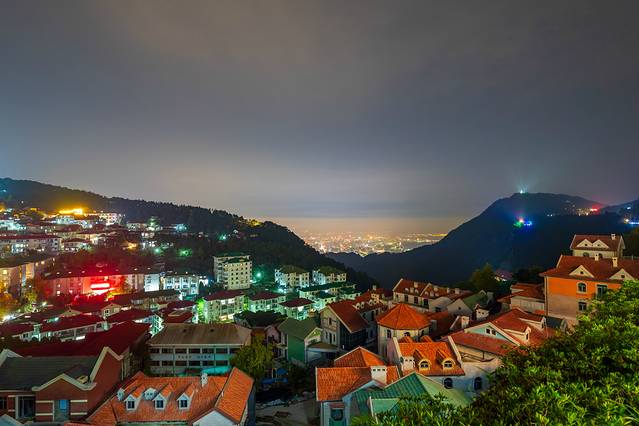 站在观景台上,虽然太阳已经落去,但其余光仍照耀在远山天际的云上,映出粉中透黄,黄中透紫的,暮霞光影。在搭配上观景台所能看到的半山建筑区,风格鲜明且独特的各种老式建筑,成群成片,依山而建,仿佛趴在半山坡一半。这半山坡的老建筑,搭配迷人的晚霞,景色简直不要太美,真的让人超贪恋这一段时光,贪恋眼前的这一幕画面。